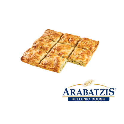 Traditional Greek country-style square pie with crispy, golden pastry and a flavorful leek filling, offering a mild, aromatic taste and excellent texture, ideal for bakery and foodservice use.