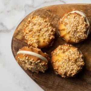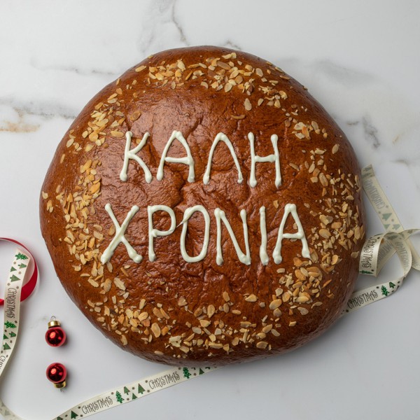 The most delicious starting point! Vasilopita is a New Year’s Pie in Greece, made of a variety of doughs. This one is like a Tsoureki, a brioche type sweet bread, fluffy and impressive, with a hidden coin for the ritual of the first day of the New Year, a unique aromatic bouguet and wonderful rich taste. You will find it in a square branded box with a transparent opening, in three flavors: classic with freshly roasted almonds, coated in white chocolate, and coated in dark chocolate.