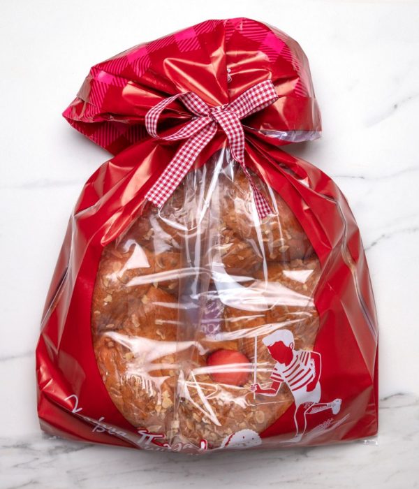 Easter brioche type doughs with a boiled red egg in the middle, baked and packaged in square branded boxes with a transparent opening for your customers to be able to see the three wonderful versions of our Greek traditional festive sweet breads: classic with freshly roasted almonds, coated with white chocolate and coated with dark chocolate.