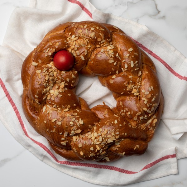 INGREDIENTS: Wheat flour, sugar, butter, milk, eggs, water, yeast, salt, orange zest, mahlepi, mastic, vanilla, vegetable oil (sunflower or similar), emulsifier (mono- & diglycerides), preservative (potassium sorbate), glazing: egg or syrup, roasted almonds.