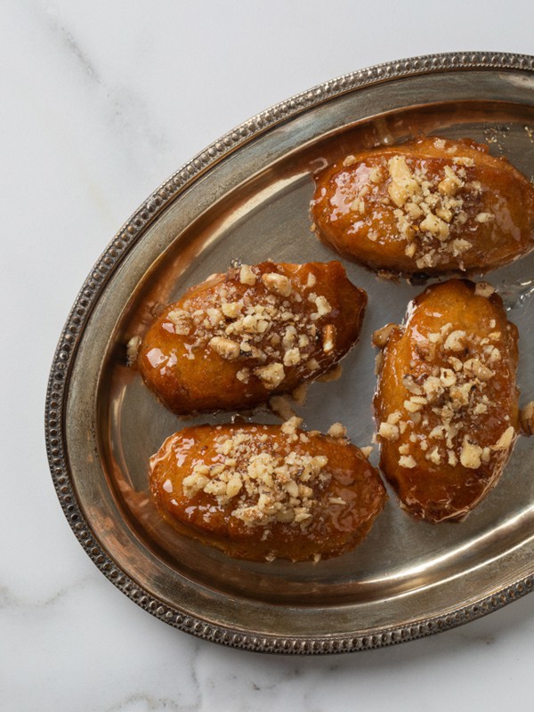 In Greece, Christmas cannot be celebrated without Melomakarona! That’s why every year, we make a wonderful, soft dough with fine semolina and fresh orange juice that is left to rest long enough for the ingredients to blend together, before baking. The result is a well-baked, fluffy dessert, bathed in delicious honey syrup and garnished with fresh walnuts. You will find our Melomakarona in four flavors, classic with honey and walnuts, stuffed with chestnut cream and also, with a couverture chocolate or a white chocolate glaze.