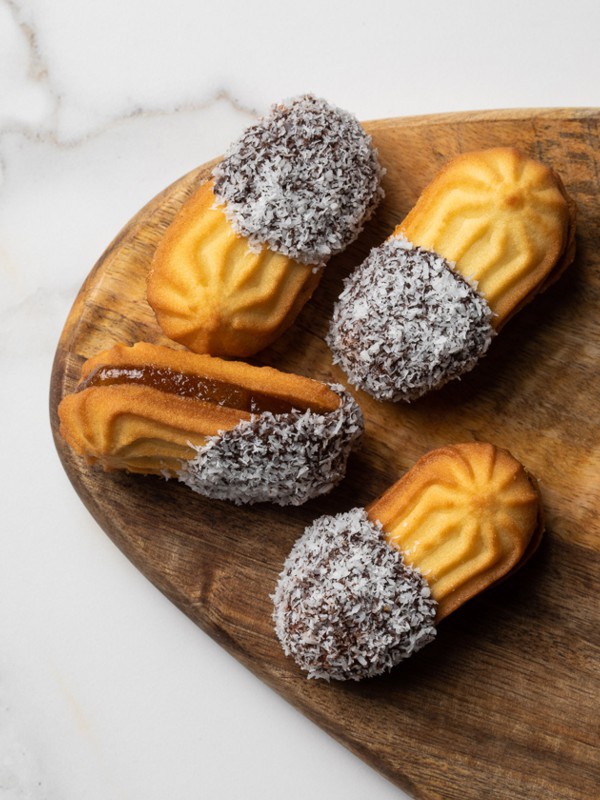 INGREDIENTS: wheat flour (gluten), margarine (partially hydrogenated vegetable oils & fats: palm, cotton seed, sunflower; emulsifier: mono‑ & diglycerides of fatty acids; salt; preservative: potassium sorbate; acidity regulator: citric acid; flavouring; colour: β‑carotene), icing sugar, egg white, butter, milk proteins, vanillin, coconut (6 %), imitation chocolate compound {sugar, hydrogenated vegetable oils [coconut, palm kernel oils], cocoa; emulsifier: soy lecithin; stabilizer: sorbitan tristearate}, apricot concoction filling (30%) {fruit (60%), sugar, pectin, acidity regulator: citric acid, preservative: potassium sorbate, apricot flavouring}.