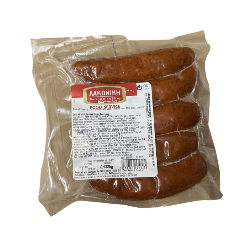 Creta Farms Country Sausages with Leek are premium-quality pork sausages, infused with fresh leek and traditional spices for a savory, flavorful taste. Each sausage measures 12 cm and ideal for grilling, pan-frying, or baking.
