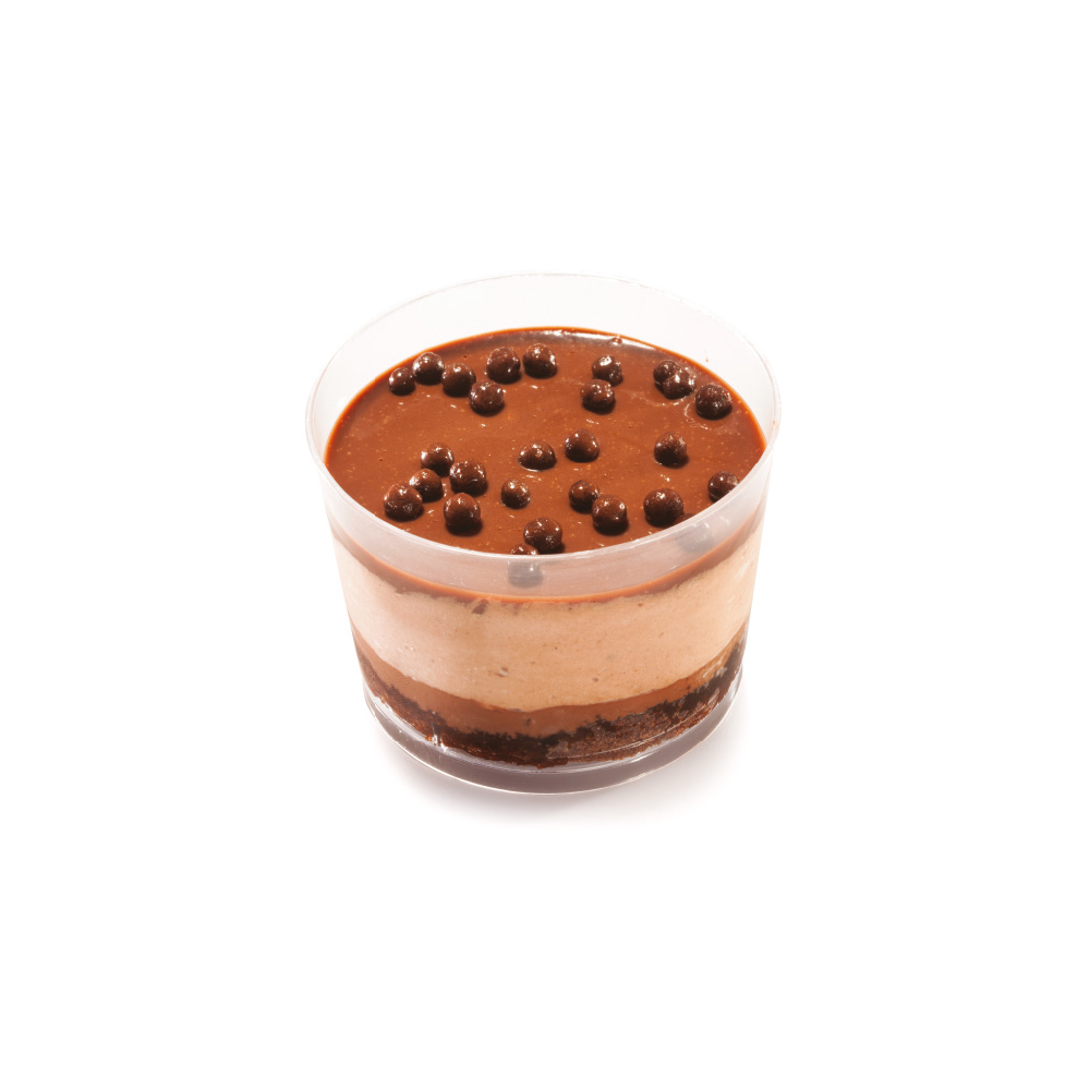 Delicate layers of praline and dark chocolate, studded with almond and caramelized hazelnut pieces, finished with a glossy chocolate coating and crunchy chocolate rice pearls.