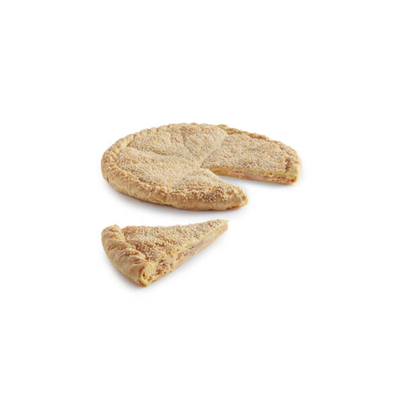 Calzone puff pastry sprinkled with sesame seeds and filled with gouda, ham, bacon and tomato & pepper sauce. It may contain lupine,mustard, celery, nuts. Allergens: wheat, milk, celery, mustard, soy, sesame. Ιnstructions: Inflation: 40°C for 60-90 minutes. For optimum appearance, optionally smear over with milk or egg. Bake at 180°C for 20-25 minutes.
